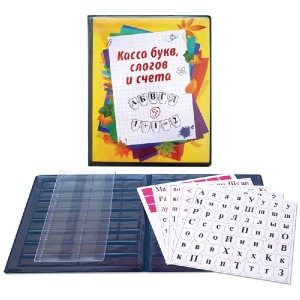 Касса букв слогов и счета для обучения детей дошкольного возраста. Касса сделана в виде раскладного планшета из ПВХ с прорезями для карточек с буквами и цифрами. Полноцветная обложка, покрыта прозрачной и плотной плёнкой. В комплект входят наглядные печатные материалы с буквами, слогами и цифрами.