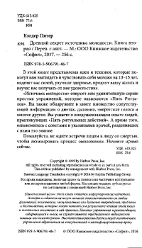 "Источник молодости" откроет вам удивительные серии простых упражнений, которые называются "Пять Ритуалов". Вы также обнаружите в ней множество сопутствующей информации о диетах, дыхании, энергетике голоса и многое другое. Вы узнаете о воодушевляющем опыте людей, практикующих "Пять ритуальных действий". И кроме того, вы познакомитесь с советами и указаниями врачей, разделивших с нами это знание.