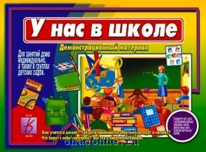 Демонстрационный материал, с помощью которого ребенок узнает как учатся в школе и что берут с собой на уроки, где дети занимаются спортом, где едят и читают.