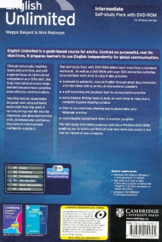English Unlimited is a six-level goals-based course for adults. Centred on purposeful, real-life objectives, it prepares learners to use English independently for global communication. The Self-study Pack consists of a Workbook with DVD-ROM. It enables learners to consolidate and build upon work done in class. The Workbook provides extra 'Explore Writing' tasks plus a complete 'Explore Reading' syllabus, as well as 'Over to you' exercises allowing personalisation of language practice. In addition to over 300 interactive practice activities, the DVD-ROM includes video for every unit featuring international speakers, documentary clips, a self-recording and playback tool for pronunciation practice, and customisable 'QuickCheck' tests to monitor progress.