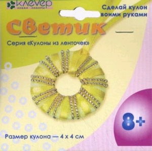 "Светик" - это набор капроновых и атласных лент и бисера, при помощи которых можно легко сделать интересное украшение в оригинальной технике оплетения лентами и бисером на проволоке картонного шаблона в форме солнца. Создав своими руками кулон-солнышко, Вы получите украшение, которое будет только у Вас. Комплектация: цветные капроновые и атласные ленты, цветной бисер, проволока, картонный шаблон, шарики из нетканого материала, двусторонняя клейкая лента (скотч), инструкция со схемами и рисунками. Размер кулона: 4 х 4 см.