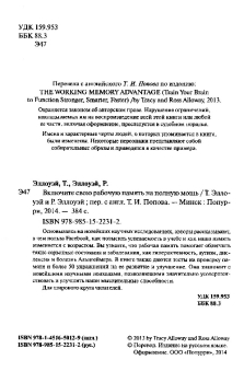 Основываясь на новейших научных исследованиях, авторы рассказывают, в чем польза Facebook, как повысить успеваемость в учебе и как наша память изменяется с возрастом. Вы узнаете, что рабочая память помогает облегчить такие серьезные состояния и заболевания, как гиперактивность, аутизм, дислексия и болезнь Альцгеймера. В книге также даются тесты на проверку памяти и более 50 упражнений на ее развитие и улучшение. Она знакомит с новейшими научными подходами, позволяющими значительно усовершенствовать и улучшить наши мыслительные способности.