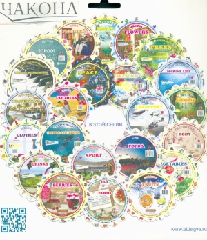 Пособие состоит из трех картонных кругов, соединенных в центре, что позволяет им вращаться вокруг своей оси. На центральном круге представлены 16 изображений и их названия на русском языке. Сопоставляя вырез на внешнем круге с изображением, можно прочитать его название на английском. То же самое - на второй стороне круга. Пособие позволяет выучить и запомнить 32 слова.
