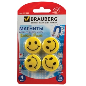 Магниты Brauberg 30 мм 4 шт Смайлики желтые блистер