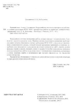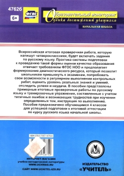 Всероссийская итоговая проверочная работа, которую напишут четвероклассники, будет включать задания по русскому языку. Практика системы подготовки к проведению такой формы оценки качества образования отвечает требованиям ФГОС НОО и предполагает формирование диагностического ресурса, который позволит школьникам привыкнуть к экзаменам, попробовать свои возможности в регулярном выполнении контрольных работ, оценить уровень реальных знаний и умений, отследить успехи и неудачи. В пособии представлены примерные итоговые проверочные работы по русскому языку и тренировочные упражнения, составленные с учетом типичных ошибок и возникающих при изучении определенных тем трудностей, а также инструкция.