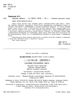 Серия "Сказки русского леса" знакомит детей с природой родного края. Автор - Валентин Сергеевич Пажетнов, заслуженный эколог России, вдохновитель и руководитель проекта по спасению, воспитанию и возвращению в природу осиротевших медвежат. Из сказки "Садовая дверца" юные читатели узнают о замечательных мастерах Тверской земли, которым добро и любовь помогают победить злые чары. Книгу украшают реалистичные и яркие иллюстрации биолога и талантливого художника-анималиста Николая Фомина. Надеемся, что маленькие читатели будут с удовольствием разглядывать эти иллюстрации, слушая сказку. Книга может быть использована как для самостоятельного чтения, так и в образовательном процессе по ознакомлению с окружающим миром.