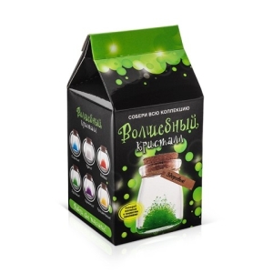 В каждом наборе: красивая баночка, в которой удобно следить за выращиванием кристаллов, волшебный кристаллический порошок, кристаллическая таблетка, палочка для перемешивания, пробка, веревочка, карточка с пожеланием и инструкция.