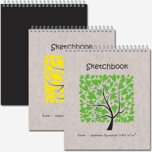 Блокнот для зарисовок , формат А5+ (170х200), 20 листов, обложка – мелованный картон, матовое лакирование, блок – черная дизайнерская бумага Notturno 140 г/м? , металлический гребень сверху, жесткая подложка.