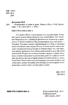 Это книга о Боге, что и указано в ее подзаголовке. В первой части книги автор убедительно показывает, что Творение Мира было не случайным физическим явлением, а произошло по Божественному Предначертанию, цель которого — Человек. Человек познает окружающий его Мир, и границы этого познания тоже заданы Богом. В этом пункте книга вызовет неоднозначную реакцию в ученом мире, что, как надеется автор, приведет к полезным дискуссиям в среде физиков и биологов. Вторая часть книги больше говорит о самом человеке, о путях Спасения человеческой души, и о смысле истории человечества как истории взаимоотношений Бога с человечеством. Книга заинтересует каждого, кто хочет понять для себя смысл жизни человека, кто интересуется историей человечества, и хочет знать его будущую судьбу.