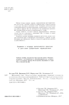 В рабочей тетради для первоклассников представлены специальные тестовые задания для проведения диагностики, разработанные на основе реальных учебных заданий. Все задания выполняются под руководством учителя, на основании его инструкций, представленных в методических рекомендациях. Кроме того, задания продублированы в тетради. В Приложении даны материалы для тренировки перед выполнением заданий и информация для учителя. Рабочая тетрадь печатается в четыре цвета, задания построены на основе рисунков, что облегчает их восприятие ребенком. Подробное описание процедуры проведения диагностики, оценки и анализа результатов представлены в методических рекомендациях для учителя.