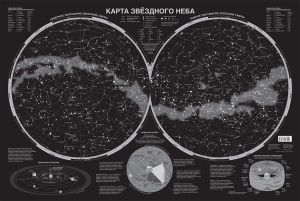 На этой необычной настенной карте размером 870х580 мм представлены северное и южноео полушария небесной сферы. Так ночное небо с мерцающими на нём галактиками, туманностями и звёздными скоплениями выглядит с Северного и Южного полюсов Земли. Наиболее яркие звёзды, формирующие созвездия, покрыты флуоресцентной краской и, заряжаясь при солнечном или электрическом свете, в темноте мерцают, создавая полную иллюзию звёздного неба.Звёзды на карте ранжированы по видимой звёздной величине. Даны названия самых ярких звёзд и условные очертания всех 88 созвездий. Приведёны краткие сведения о Солнечной системе, небесной сфере, звёздных координатах, эклиптике и зодиакальном круге. Карта может быть рекомендована всем, кто интересуется астрономией и любит романтику. Карта упакована в прозрачный тубус (пакет с объёмным дном и еврослотом) из мягкого пластика. Размеры тубуса: длина 590 мм, диаметр 50 мм.