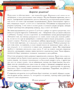 Эта книга предназначена для детей от 2 до 6 лет и требует не просто присутствия, но и активного участия взрослого. Собственно, она — бескрайнее поле для вашего общения с ребёнком. Словарь малыша ограничен: за исключением самых распространённых обиходных слов, вы никогда доподлинно не знаете, какое слово уже знакомо ребёнку, но сам он его ещё не употребляет, о значении какого только догадывается, а какое слышит впервые. Поэтому для маленького ребёнка представляют огромный интерес не только сами картинки, но и ваша речь, ваши комментарии. Ребёнок усваивает новые слова легко, из контекста, и если в вашей жизни не происходит каких-либо новых ситуаций, то не появляется и новых слов, связанных с ними. Эти ситуативные пробелы и призвана восполнить наша книга. С ней вы можете называть знакомые предметы, рассказывать о новых, искать причинно-следственные связи. Таким образом, постепенно будут развиваться внимание, мышление и речь ребёнка. Отсутствие авторского текста допускает вариативность описания. Будет очень хорошо, если каждый раз вы будете строить рассказ-описание по-новому. Например, один раз можно сказать, что человек поскользнулся на банановой кожуре и упал, в другой раз про него же можно сказать, что он шмякнулся, потому что плохо смотрел под ноги.