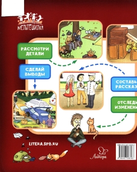 Перед вами не обычная книга — это книга-мельтешилка. Картинки в ней преобладают над текстом, будто сами рассказывают свои истории. Они «мельтешат» персонажами, предметами, происшествиями. На этих больших картинках, как и в жизни, происходит много событий. Кроме сменяющихся персонажей, создающих «шум», в книге есть и постоянные. Наблюдая за их передвижениями от рисунка к рисунку, о них можно многое узнать и сочинить целую историю, которая не будет противоречить авторскому замыслу, ведь в книге текст вторичен! Эта книга предназначена для детей от 2 до 6 лет и требует не просто присутствия, но и активного участия взрослого. Собственно, мельтешилка — бескрайнее поле для вашего общения с ребёнком. Словарь малыша ограничен: за исключением самых распространённых обиходных слов, вы никогда доподлинно не знаете, какое слово уже знакомо ребёнку, а какое он слышит впервые. Поэтому для маленького ребёнка представляют огромный интерес не только сами картинки, но и ваша речь, ваши комментарии. Ребёнок усваивает новые слова легко, из контекста, ведь если в вашей жизни не происходит каких-либо новых ситуаций, то и не появляется новых слов, связанных с ними. Эти ситуативные пробелы и призвана восполнить наша книга. С ней вы можете называть знакомые предметы, рассказывать о новых, искать причинно-следственные связи. Таким образом, постепенно будут развиваться внимание, мышление и речь ребёнка.