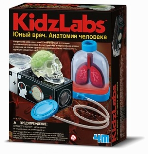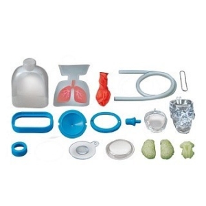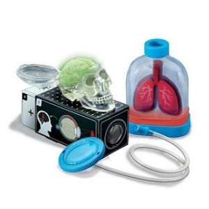 В комплекте: картонные легкие; внешний корпус проектора; внутренний корпус проектора; полоска для измерения скорости реакции; пластиковая линза; полупрозрачная пленка; цепочка; светящиеся части мозга; пластиковый череп; диафрагма и синий диск; прозрачная пластиковая воронка; гибкая трубка; наушник; пакет с легкими; пластиковая колба для легких; синяя крышка; надувной шар; синее дно.