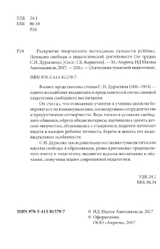 В книге представлены статьи С.Н. Дурылина (1881–1954) — одного из наиболее выдающихся представителей отечественной педагогики свободного воспитания.Он считал, что отношения учителя и ученика должны базироваться на взаимоуважении, полноправном сотрудничестве и продуктивном сотворчестве. Ведь только в условиях свободного общения, обретя общие интересы, научившись ценить детское творчество, сблизившись с учащимися, педагоги начинают видеть в каждом ребенке личность, беречь и ценить его индивидуальные особенности. С.Н. Дурылин последовательно отстаивал гуманистические идеалы свободы в образовании, резко критиковал традиционную школу и педагогику, выдвигал идеалы воспитания и обучения, созвучные идеям современной педагогики.