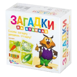 Набор пластмассовых кубиков 4 штуки из серии «Загадки на кубиках» предлагает ребенку собрать и отгадать три загадки на тему «Овощи».