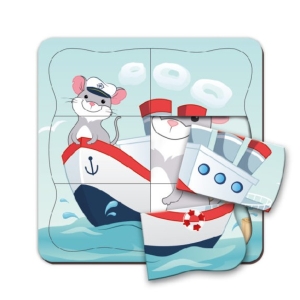 Перед ребенком – двухслойная основа с пейзажем у моря. Мышонок стоит на причале, а позади – его корабль. Малыш должен сложить пазл так, чтобы мышонок поплыл на корабле. Вперед! Пора покорять морские просторы.