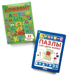 В состав комплекта входят два набора карточек-пазлов для изучения алфавита, счета, цветов и формы.