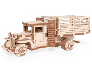 У собранной модели вращаются колеса и откидывается задний борт кузова. При желании игрушку можно раскрасить акриловыми красками.