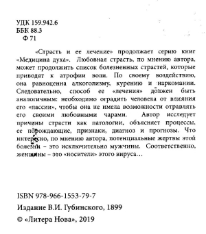 "Страсть и ее лечение" продолжает серию книг "Медицина духа". Любовная страсть, по мнению автора, может продолжить список болезненных страстей, которые приводят к атрофии воли. По своему воздействию, она равноценна алкоголизму, курению и наркомании. Следовательно, способ ее "лечения" должен быть аналогичным: необходимо оградить человека от влияния его "пассии", чтобы она не имела возможности отравлять его своими любовными чарами. Автор исследует причины страсти как патологии, объясняет процессы, ее порождающие, признаки, диагноз и прогнозы. Что интересно, по мнению автора, потенциальные жертвы этой болезни - это исключительно мужчины. Соответственно, женщины - это "носители" этого вируса