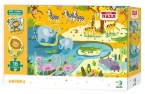 Пазл-сортер "Африка" в собранном виде представляет собой иллюстрацию, на которой изображена далекая Африка с ее своеобразным ландшафтом и диковинными животными. Здесь вытянули свои шеи жирафы, на ветках деревьев расположились туканы с огромными клювами, яркие попугаи и шумные обезьяны. В водоеме плескаются слоны, розовые фламинго, плавают зубастые крокодилы. Поблизости отдыхают бегемоты и львы, а рядом пробегает стадо антилоп и зебр. Если присмотреться, то можно увидеть змею, бабочек, жуков. Чтобы составить картину, малышу необходимо правильно соединить 18 крупных деталей.