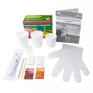 В состав набора входят: альгинат натрия, краситель натуральный (2 шт.), хлорид кальция, шприц, стакан пластиковый большой (2 шт.), стакан пластиковый малый, палочка для размешивания, перчатки, инструкция.