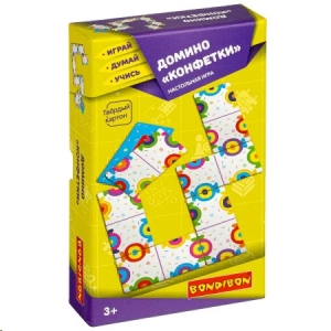 Возраст 3. Авторская разработка. КОЛИЧЕСТВО ИГРОКОВ 1-4. В комплект игры входят 30 карточек домино. Цель игры первым выложить все свои карточки домино, присоединяя их в правильном порядке. Играть в неё весело и совсем несложно. Первое, что необходимо сделать это перевернуть все карточки домино лицевой стороной вниз и перемешать. Все игроки получают по 6 карточек, остальные карточки находятся в банке, лицевой стороной вниз. Игру начинает самый младший. Следующий игрок добавляет карточку домино, на которой изображена конфетка такого же цвета полосочек как на той, что лежит на столе. Каждая карточка домино присоединяется к крайней карточке, выкладывая змейку, только одной стороной её половинки. Если у кого-то из игроков нет карточки домино с похожей картинкой, то он берёт карточки из банка. Если карточки закончились и в банке, этот игрок пропускает ход. Игрок, у которого раньше всех закончатся карточки домино, становится победителем.