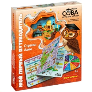 Игра-викторина МОЙ ПЕРВЫЙ ПУТЕВОДИТЕЛЬ. СТРАНЫ АЗИИ серии Умная сова от Bondibon разработана на основе авторской методики для детей от 6 лет. В комплект входят 11 двусторонних карточек из твёрдого картона и рулетка. Cерия Умная сова от Bondibon разработана на основе авторской методики для детей от 6 лет. лучший помощник юному путешественнику. С ней вы отправитесь в увлекательное путешествие по странам Азии узнаете, чем славятся азиатские столицы познакомитесь с главными достопримечательностями выясните какая валюта в той или иной стране, флаг, язык и национальные блюда. Хорошо ориентироваться в путешествиях вам помогут красочные географические карты на каждой игровой карточке. Итак, выберите страну Азии и отправляйтесь в путешествие!