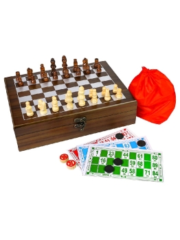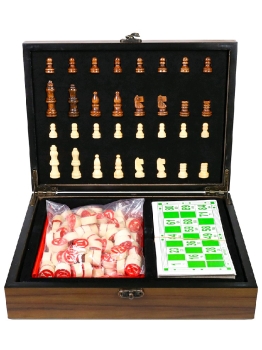 Комплект 2 в 1 в деревянном футляре включает в себя две игры: русское лото и шахматы. Размер футляра: 26 х 19 х 7 см. На шахматной доске не нанесены буквы и цифры. Состав набора: шахматные фигуры - 32 шт., мешочек - 24 х 15 см, карточки - 48 шт. 16 х 8 см, накрывашки - 40 шт., бочонки - 90 шт.