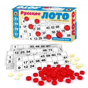 усское лото – старинная игра; завоевавшая огромную популярность среди детей и взрослых. В набор игры входят 24 игровые карточки; пластмассовые фишки с номерами; пронумерованные от 1 до 90; картонные жетоны; правила. В ходе игры ведущий достает по одной фишке и называет номер. Игроки находят и отмечают жетонами числа на своей карточке. Выигрывает тот; кто первым закроет все числа на карте. Упаковка имеет компактный размер; игру удобно взять с собой в дорогу. Состав набора: карточки – 24 шт.; фишки с номерами – 90 шт.; жетоны – 50 шт.; правила.