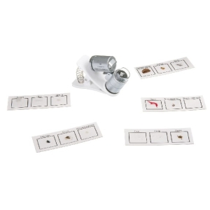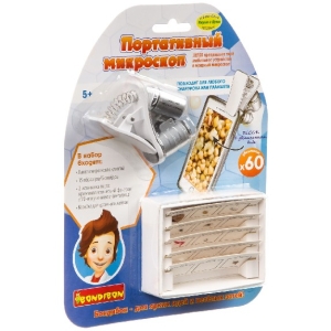 Универсальный портативный микроскоп с зажимом и 15 готовых образцов на 5 слайдах. Микроскоп подходит для любого смартфона и планшета. Закрепляется с помощью специального зажима. Дает возможность рассматривать предметы в 60-кратном увеличении, снимать их на фото и видеокамеру. Имеет 2 источника света: криминалистический фонарик с УФ-излучением и светодиод.