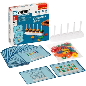 В комплект настольной обучающей игры «СОРТИРОВКА ФИГУР» серии Обучение легко и интересно от Bondibon входит 13 двусторонних карт-заданий, сортировочная планка и 50 пластиковых фигур различных цветов и размеров.