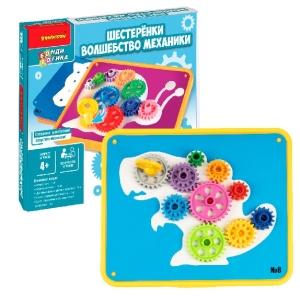 В комплекте: игровое поле, 16 игровых карточек из плотного картона, 10 шестеренок разного размера и разных цветов, 1 ключик (запускает вращение), буклет с правилами и заданиями.