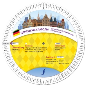 Диск-вертушка с глаголами сильного и неправильного спряжения отлично подойдет всем, кто изучает немецкий язык. В диске-вертушке помещены 72 глагола в трех основных временных формах. К инфинитиву дан русский перевод. На обороте представлены глаголы, которые сгруппированы по способу образования форм прошедшего времени. Наглядная подача материала позволит легко и быстро выучить формы немецких глаголов. Удобное и компактное подспорье для всех, кто изучает немецкий язык.