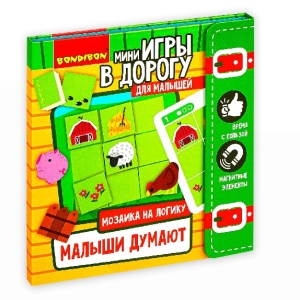МОЗАИКА НА ЛОГИКУ "МАЛЫШИ ДУМАЮТ" - это занимательная магнитная головоломка на пространственное и логическое мышление для детей от 3 лет. Добро пожаловать на ферму! Ваш малыш познакомится с ее забавными жителями - свинкой, курочкой, овечкой и будет выстраивать разнообразные сюжеты с ними согласно заданиям и подсказкам в буклете. Сюжеты имеют три уровня сложности, в конце буклета вы найдете ответы. В комплект входят: магнитное поле, 9 элементов мозаики, буклет с 18-ю сюжетными заданиями. правилами, подсказками и ответами. Забудьте о скучных путешествиях вместе с замечательными мини-играми в дорогу от BONDIBON!