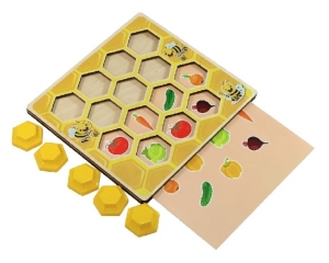 Играйте в «МЕМО: Веселые пчелки» разными способами: попросите малыша закрыть фишкой ячейку с каким-то предметом или персонажем, имеющим нужные характеристики, отыскивайте пары одинаковых картинок и накрывайте их фишками или наоборот найдите на закрытом поле.
