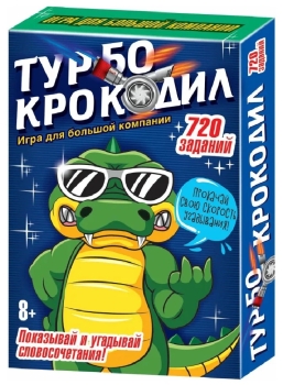 Турбо-крокодил - это веселая игра-пантомима для детей и взрослых. Правила игры просты: за отведённое время участникам предстоит отгадать, как можно больше слов, используя только движения своего тела и прилагательные-подсказки. Игрок зачитывает вслух прилагательное, а далее с помощью пантомимы показывает второе слово. Выигрывает тот, кто угадал больше всего словосочетаний. В этой игре отводится ограниченное время на отгадывание максимального количества словосочетаний. Эта интересная и динамичная игра сделает любую вечеринку незабываемой, раскроет эмоции игроков и развеселит любую компанию! В комплект входят 72 карточки с 720 заданиями и правила игры.