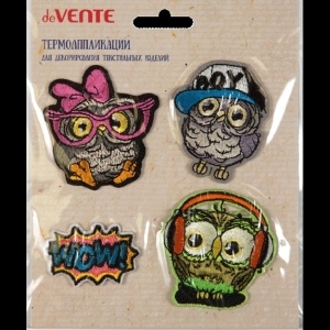 Набор термо аппликаций 4шт Owls сова в очках 57x61 мм, сова в кепке 47x58 мм, сова с наушниками 58x60 мм, WOW 35x50 мм