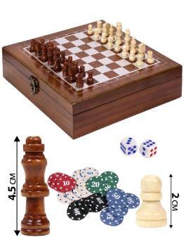 Комплект 2 в 1 в деревянном футляре включает в себя две игры: покер и шахматы. Состав набора: шахматные фигуры деревянные 24 шт. (король - 4,4 см, пешка - 2 см); 2 колоды карт (54 шт); игровые кубики - 5 шт.; фишки с номиналом. Вес фишки в наборе - 3,7 г, диаметр - 4 см, толщина - 3 мм. Номиналы фишек: белый - 5, красный - 10, зелёный - 20, синий - 50, чёрный - 100. В наборе по 40 штук фишек каждого номинала, они хранятся в специальной подставке. Фишка Dealer - 1 шт.: 4 см в диаметре и 3 мм в толщину. Размер набора: 24 х 24 х 7 см.