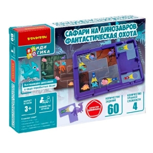 Настольная игра САФАРИ НА ДИНОЗАВРОВ. ФАНТАСТИЧЕСКАЯ ОХОТА развивает логическое мышление, познавательные способности, улучшает зрительно-моторную координацию движений, тренирует концентрацию внимания, влияет на эмоциональное развитие ребенка. Кто откажется от такого приключения, как охота на динозавров? Выслеживайте динозавров с помощью головоломки серии БондиЛогика. Поместите выбранную карточку с заданием на игровое поле, выложите детали головоломки таким образом, чтобы каждый динозавр оказался в луче света фар автомобилей охотников. У каждого задания есть только одно верное решение – и его можно найти в буклете с правилами. В игре 60 заданий и 4 уровня сложности. В комплект входят игровое поле, 6 игровых деталей, 30 двухсторонних карточек с заданиями, буклет с правилами и решениями. Для 1 игрока. Возраст 3+