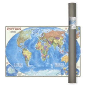 На политической карте мира подробно отражено современное политико-административное устройство мира, даны границы государств. Территории государств выделены цветом. Населённые пункты отображены по числу жителей и административному значению, показаны основные наземные пути сообщения и судоходные каналы. Особенность данной карты в том, что на ней, помимо геополитической информации, размещена символика государств мира. Государственные флаги стран мира сгруппированы по каждому континенту.
