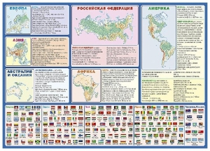 На лицевой стороне политическая карта мира, на оборотной справочная информация странам и континентам.