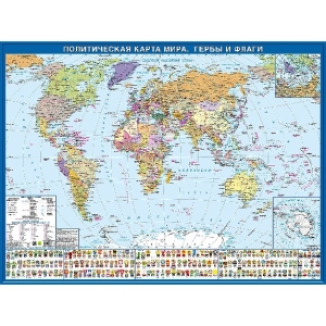 Политическая карта Мира отпечатана на плотном картоне с глянцевой двусторонней ламинацией. Содержит изображения гербов и флагов. Размер карты 590 х 430 мм Масштаб 1:58 млн. Карта может использоваться как справочно-информационное и учебное пособие. Углы карты закруглены.