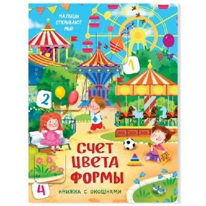 Эта книга для любознательных малышей! На каждом развороте окошки с сюрпризами и увлекательные задания! Пособие поможет научиться считать до десяти, различать цвета и запомнить названия геометрических фигур. Все развороты имеют разную структуру и наполнение. Это самый настоящий виммельбух с окошками и заданиями! Издание подойдет для занятий с детьми в возрасте от двух лет. Развивает память, логику, мелкую моторику, зрительное восприятие, закладывает основы знаний о счете, формах, фигурах, цветах. Книга большого формата, изготовлена из плотного целлюлозного картона, на обложке глянцевая ламинация, а все страницы покрыты защитным безопасным лаком. На пяти разворотах 44 окошка разного размера и формы с познавательной информацией и заданиями по теме разворота. Размер окошек удобен для детских пальчиков. При первом прочтении рекомендуем помочь малышу открыть окошки. Для удобства первого открывания предусмотрена выемка под палец на каждом окошке.