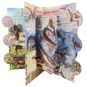 Это очень необычная по форме книга. Она напоминает карусель с объемными картинками. При этом книгу удобно читать, развороты раскрываются полностью. В доступной, наглядной и увлекательной форме книжка рассказывает о самых древних динозаврах, морских и летающих ящеров, динозавров равнин, лесов и подводных глубин. Мы спросили у разных пап и мам, какие вопросы про динозавров задают дети и постарались в нашей книге на них ответить.