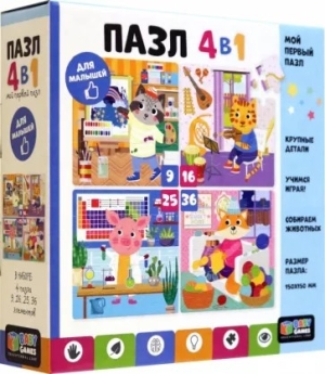 Набор пазлов 4 в1 - это комплект пазлов с разной элементностью, включающий в себя головоломки из 9, 16, 25 и 36 элементов, объединенных общей тематикой. Постепенно усложняя сборку пазла от 9 элементов до 36 элементов, ребенок научится внимательности, концентрации, а также сможет развить мелкую моторику.