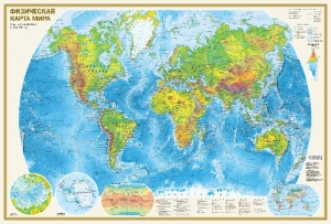 Настенная Физическая карта мира масштаба 1:32 000 000 (в 1 см 320 км) имеет размеры 1170х790 мм. Благодаря удачно подобранной цветовой шкале высот и глубин с множеством градаций на карте наглядно показан рельеф суши Земли и дна Мирового океана. Подробно отражена гидрологическая сеть материков. Приведены названия всех основных морфоструктурных форм земной поверхности (горных систем и хребтов, равнин, низменностей и пр.). Хорошо различимыми пунсонами показаны населённые пункты с градациями «более 1 млн жителей», «от 100 тыс. до 1 млн жителей» и «менее 100 тыс. жителей». Основная карта дополнена врезками на Арктику и Антарктиду, а также картами «Климатические пояса» и «Природные зоны суши». Рекомендовано для широкого круга пользователей.