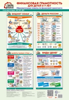 Комплект образовательных плакатов «Финансовая грамотность для детей 5-7 лет» состоит из 4 плакатов А3: «Бюджет семьи», «Деньги России», «Валюты разных стран», «Виды денег» – и поможет ребёнку развить финансовую грамотность. На обороте плакатов приведены методические рекомендации и сценарии занятий, включающие вопросы и задания, стихи, загадки. Комплект подходит для индивидуальных и групповых занятий с детьми дошкольного и младшего школьного возраста, может использоваться в повседневной деятельности и на занятиях. Адресован родителям и педагогам образовательных организаций.