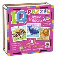 В наборе собрано 8 красочных изображений забавных животных. Каждая картинка складывается из четырёх частей. Всего в коробочке 32 детали.