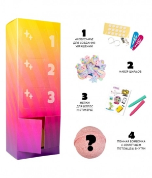 В наборе есть все, чтобы повторить образ любимой куклы и сделать игровой процесс интересным: шармы, из которых можно сделать множество аксессуаров, мелки для волос, яркие стикеры, а также сюрприз в виде пенной бомбочки с секретным питомцем внутри!